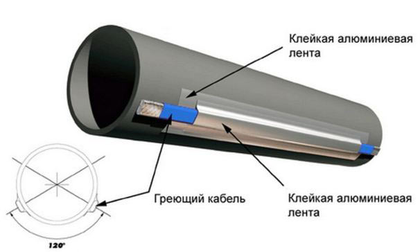 Ако говорим за това как да поправим нагревателния кабел за водоснабдяване, тогава препоръчваме да използвате алуминиева лента за това - това не само ще фиксира сигурно продукта, но и значително ще увеличи неговия топлопренос. Като алтернатива можете да използвате лепяща лента за фиксиране, като я увиете около водопровода, както е показано на изображението по-долу.