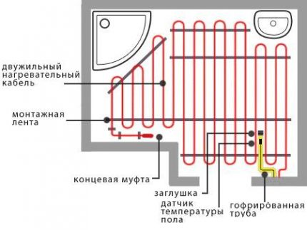 Разположението на отоплителния кабел в банята според системата "топъл под". Телта се поставя със "змия" по цялата площ на стаята, така че двата края да са в противоположни ъгли
