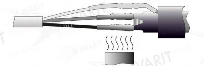 - Тръбите, предварително поставени на всяка сърцевина, се изместват и обработват със сешоар. След това трябва да се направи същата операция с тръбите, които са поставени на основния проводник. Отначало по-малка, после по-голяма.