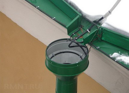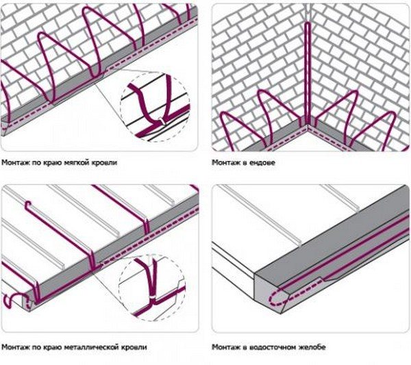 По този начин, за да се получи добър резултат, е необходимо да се оборудва отопление на покрива и околните канали. В повечето случаи нагревателният кабел е монтиран на стрехите на покрива, вътре в улуци и във фунии, при съединения на покривни фрагменти, по долините. Освен това отоплението трябва да присъства по цялата дължина на водосточните тръби, във водосборниците и отводнителните тави.