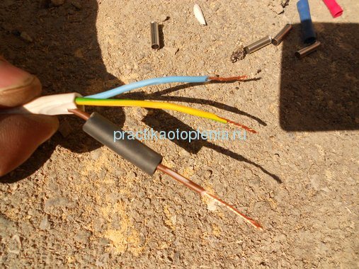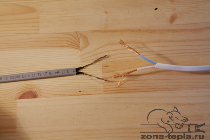 След като разгледате бъдещата работна площадка, трябва незабавно да отрежете отоплителния проводник - за да завършите прекратяването му. За да направите това, вземете свободния край на проводника, към който не трябва да се свързва нищо, отрежете го с "стъпка", като премахнете защитния слой.