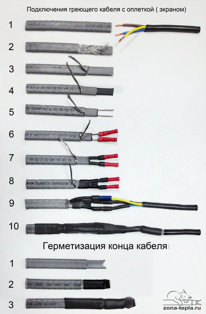 По-долу, на три снимки, са показани накратко етапите на свързване на саморегулиращ се нагревателен кабел без екран, с екран и нагревателен кабел вътре в тръбата с адхезивен комплект съединители (последният се отличава с крайна капачка). Подробни статии на съответните връзки.