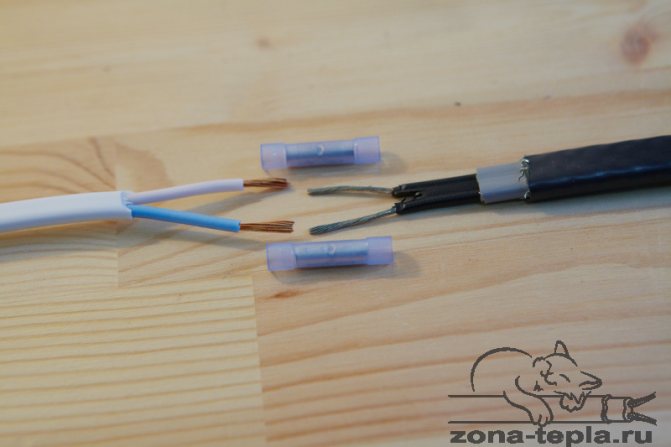 Принципът на свързване на саморегулиращ се нагревателен кабел е много прост. Достатъчно е просто да свържете проводящите ядра към мрежата 220. И е задължително да изолирате втория край на нагревателния кабел, така че да няма контакт между проводящите ядра. Плитка за заземяване, ако има такава.