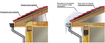 Покрив с недостатъчна топлоизолация се счита за топъл. Те позволяват на топлината да преминава навън, така че дори при отрицателни температури на повърхността на топъл покрив, снежната покривка може да се стопи. Получената вода изтича върху студените фрагменти на покрива и замръзва, образувайки лед. Поради тази причина е необходимо да се организира отоплението на ръба на покрива.