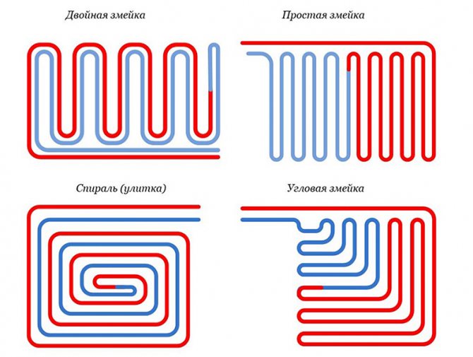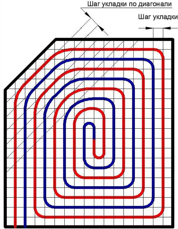 Съществува и обозначението "спирала" или "обвивка". В такава схема температурното поле се разпределя по повърхността на пода по-равномерно, тъй като тръбите на директната и обратната верига се полагат последователно.