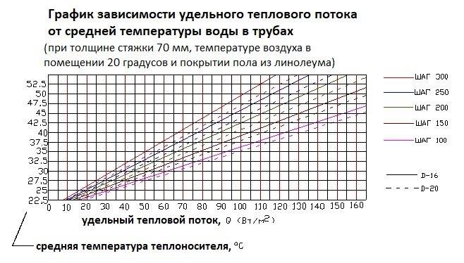Умножавайки получената стойност с 1,2, получаваме необходимата мощност на топъл под, за да компенсираме топлинните загуби. Използвайки графиката на зависимостта на топлинния поток от температурата на охлаждащата течност, можете да определите подходящата стъпка и диаметър на тръбата.