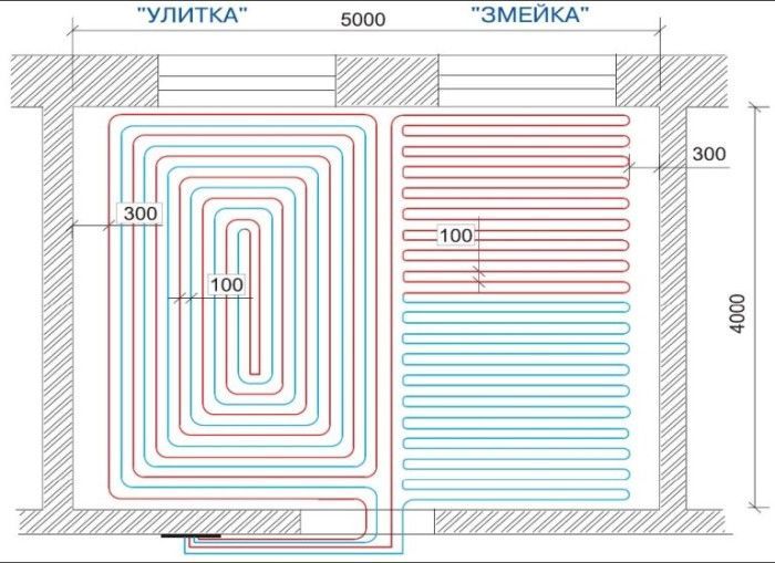 Необходимо е да се вземе решение за. Има 2 основни опции - змия и охлюв (спирала). Освен това на милиметрова хартия, като се вземе предвид размерът на помещението в мащаб, се изготвя диаграма на оформлението на контурите. Изчисленията най-вероятно ще трябва да се извършат няколко пъти. Следователно, при изчисляването на тръби за топъл под, онлайн калкулатор ще може да предостави безценна помощ.