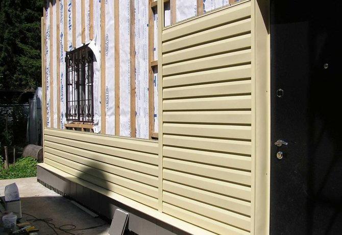 Върху фиксираната хидроизолация под сайдинг от бара или метален профил е монтирана контрарешетка, втората опция е по-трайна и надеждна