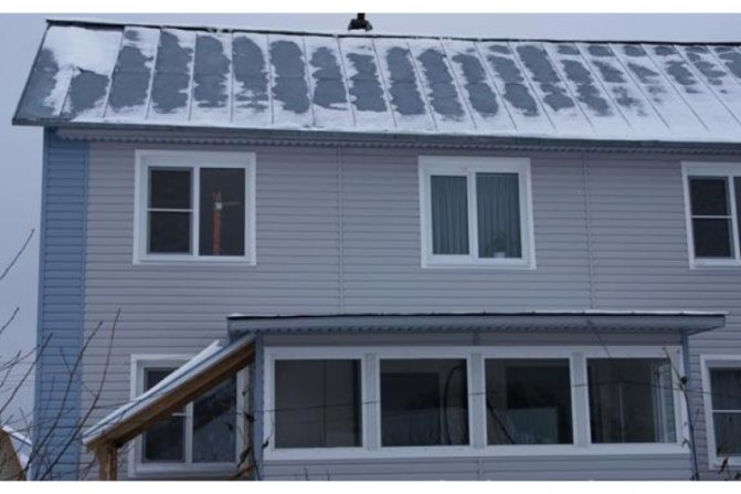 - Снегът, трупащ се под билото на покрива, постепенно се топи и се стича по стените. Ако е монтиран хидроизолационен материал, влагата преминава през него до основната слепа зона, а след това към дренажната система.