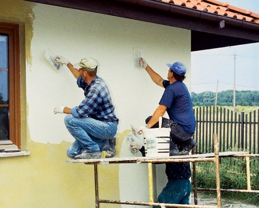 Снимката показва процеса на нанасяне на мазилка върху фасадата.
