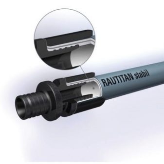 : тип от които - PE-Xc-Al-PE е в състояние да издържи на работно налягане от 10 бара при температура от 95 ° C. Стабилните тръби RAUTITAN се произвеждат с външен диаметър 16-40 мм и се препоръчва да се използват за монтаж на открито положени тръбопроводи (цокъл разпределителни, щрангове и мрежи) във всички водоснабдителни и отоплителни системи, цветът на тръбата е стоманено сиво.