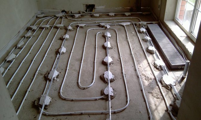 Преди да излеете груба замазка на водно топъл под, е необходимо да инсталирате захранващи кабели и други инженерни линии. Стените и таванът са изравнени с гипсов хоросан. Ако извършвате работата в обратен ред, ще трябва да изчакате, докато замазката се втвърди. След това ще е необходимо да го почистите от нови замърсители.