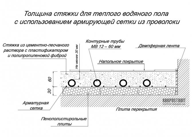Размерът на слоя зависи от диаметъра на тръбите, ако изчислим от повърхността на контура, тогава индикаторът, с изключение на топлоизолационната торта, ще бъде 2-5 см. Технологията за монтаж позволява да се изключи металната мрежа от тортата под контура и замествайки я с фибри в състава на разтвора. В този случай дебелината на замазката над тръбите на водоподовия под се увеличава, минималната маркировка е 4,5 см. Съответствието с препоръчаните стойности ще осигури равномерно отопление и безопасно използване на топъл под.
