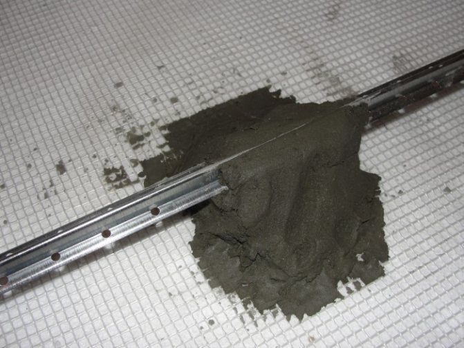 - TP замазката в къщата (апартамента) е направена с циментово-пясъчна смес, подсилена с мрежа или пластмасови влакна върху изолационен субстрат 2-3 см със задължително добавяне на пластификатор