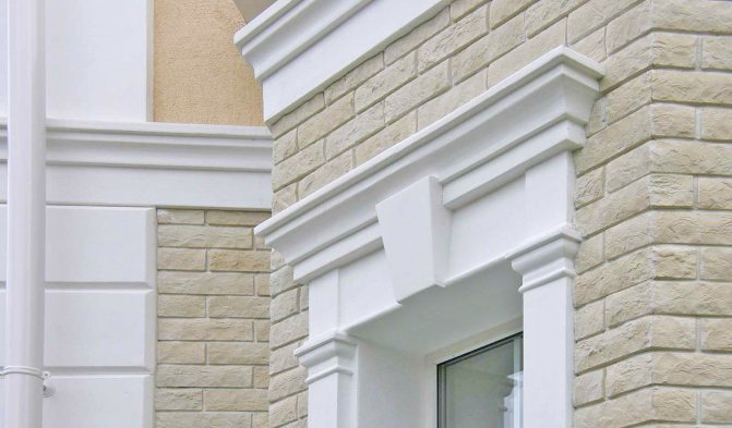 Съвременните дизайнери използват по-леки материали за фасади. Фасаден декор от експандиран полистирол се характеризира с лекота на монтаж и издръжливост. За разлика от дървените и гипсовите конструкции, материалът не се страхува от влага. В сравнение с каменните изделия, пяната е лека. Избирайки желания нюанс в широка гама от цветове, можете благоприятно да определите основния цвят на сградата или да изберете контрастен завършек.