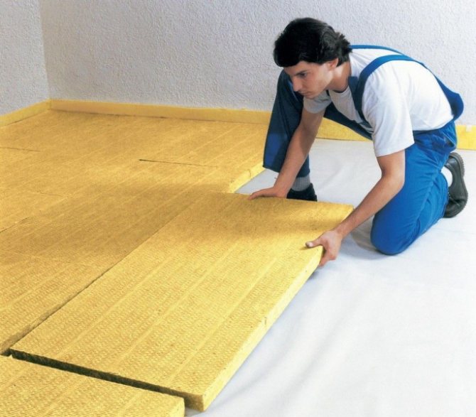 - Минерална вата, която се характеризира с леко тегло, ниска плътност и топлопроводимост. Друго предимство е достъпна цена и ниска цена. За минералната вата влагата представлява особена опасност. При контакт с влага нивото на топлоизолационните свойства значително намалява. Дизайнът изисква крепежни елементи от дървени трупи, между които се полагат изолационни плочи, а върху тях е необходимо да се положи хидроизолация, чието полагане се припокрива с залепване на шевовете с устойчива на влага строителна лента.