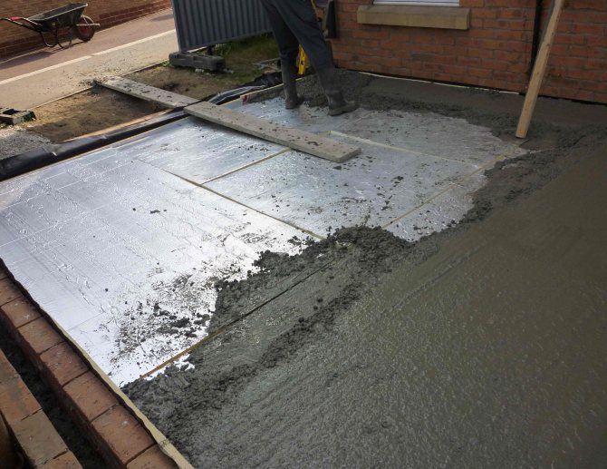 Изливането се извършва със смес от цимент и пясък. Замазката може да бъде мокра или суха. Решението се взема от собственика на къщата. За изолация на бетонния под в гаража вижте това видео:
