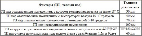 В зависимост от спецификата на полагане (на земята, на топъл под, в южния регион, на вечно замръзналост и т.н.), дебелината на изолацията за топъл воден под може да бъде 3-20 сантиметра. Използвайки EPS, е възможно да се извърши изолация с най-малка дебелина.