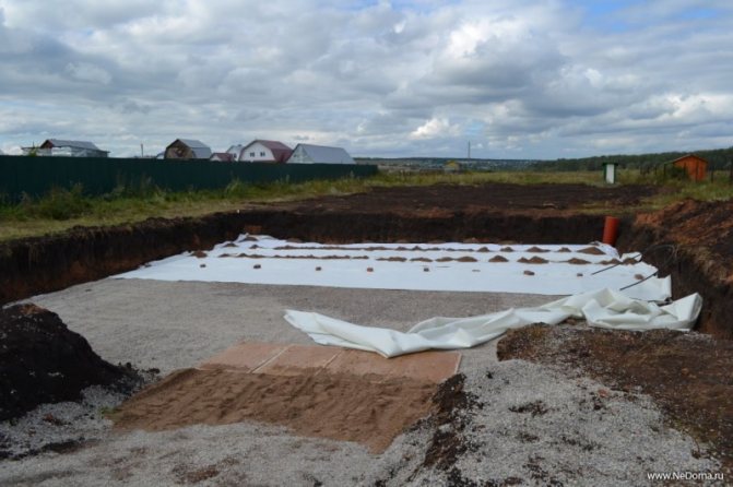 За да изолирате основата, първо трябва да изберете част от почвата около периметъра на основата, широка около 0,5 м и дълбока 20-25 см под основата на основата. Останките от изкопаната почва се отстраняват внимателно, всички неравности се изглаждат. На повърхността се нанася хидроизолационен материал (за предпочитане на два слоя). След това жлебът се запълва с пясък или чакъл, внимателно набиване, така че слоят да е на ниво с основата на основата.