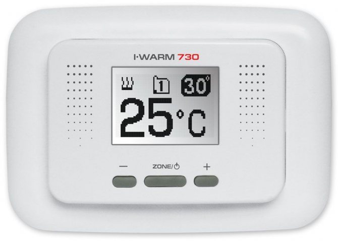 Снимката показва най-простия термостат с температурен сензор, който ви позволява само да зададете температурата на отоплението, без възможност за промяна през деня.