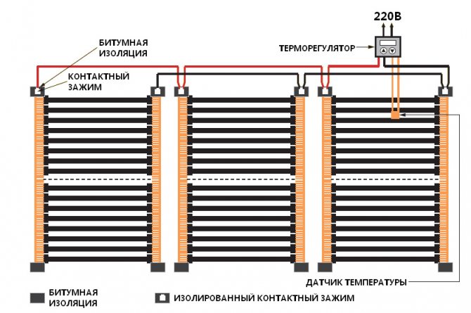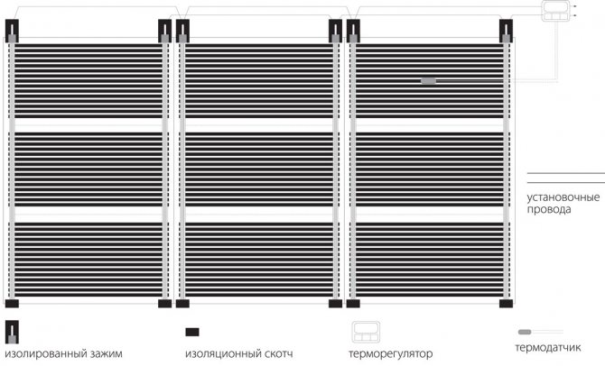 Филм топъл под работи от стандартна мрежа 220 V, 50 Hz... Свързване на ленти към мрежата - паралелно... Схематична схема на свързване на филмов топъл под (отново, фокусирайки се върху нашия пример) е представена по-долу.