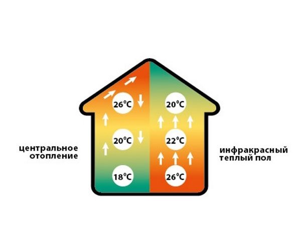 - Равномерно нагряване на въздуха в помещението - за разлика от електрическите конвектори, батериите за централно отопление, топлият инфрачервен под допринася за по-равномерно нагряване на въздуха в помещението: топлите въздушни маси, които се издигат от пода и се издигат до тавана, се охлаждат много бавно . Благодарение на това се създава комфортна температура от +22 до + 24 + 25 ° C в помещение на височина със средна човешка височина (1,7-1,8 m).