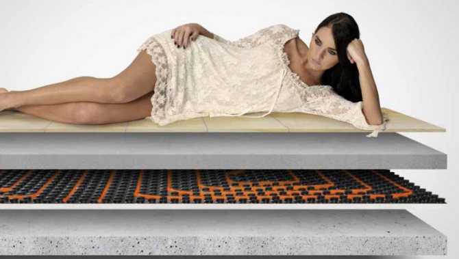 - Ако такъв под трябва да се монтира под плочка, тогава се препоръчва да се постави монтажна мрежа от фибростъкло. След това трябва да изберете материал за топлоизолация, който лежи под плочката.
