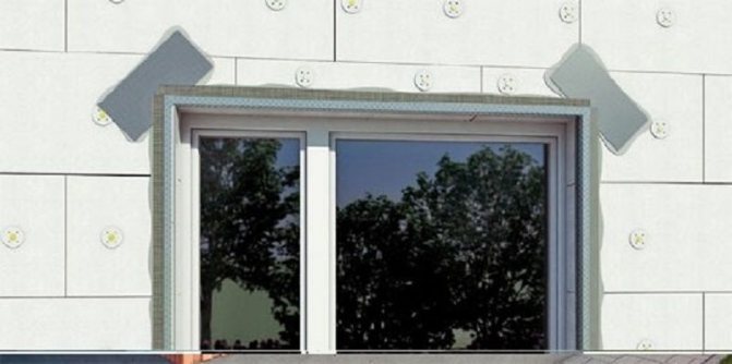 В ъглите на предните отвори (прозорци, врати) изолацията трябва да бъде закрепена с цял лист, с допълнително отрязване на излишния фрагмент. Съединенията между изолационните плочи не трябва да съвпадат с въображаемата линия на продължението на ъгъла на отваряне. Неправилното фиксиране на дъските в ъглите може да доведе до образуване на пукнатини в топлоизолационния слой.