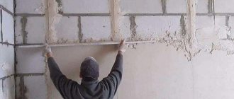 Оценете степента на отклонение на стените от вертикалата с помощта на отвес и равномерността на стените с помощта на дълга релса. Издутини повече от 1 cm.трябва да се намали. Леките отклонения и неравностите на стените трябва да бъдат изравнени с лепило. Внимателната подготовка и подравняването на стените в бъдеще ще позволи да се избегнат допълнителни слоеве мазилка и ненужна консумация на скъпи материали, за да се създаде правилната геометрия на фасадата.