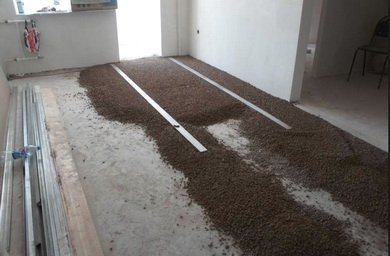 Следващият етап от създаването на под от гипсофазер е изравняваща постелка. В бъдеще не трябва да потъва, да се удебелява, т.е. не трябва да се създава прецедент за провисването на гипсовия под. Препоръчва се да се използва финозърнеста експандирана глина със слой до 100 mm. Ако слоят е по-голям, тогава е необходимо да се нанесат 3 слоя GVL, по 10 mm всеки.
