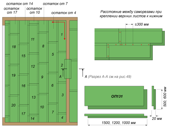 - Нанасяме лепилен състав върху завършената повърхност и монтираме втория слой плочи, като ги поставяме „в разгъната позиция“ с отстъп 250–300 mm. За надеждност може да се прикрепи към летвите с помощта на по-дълги винтове.