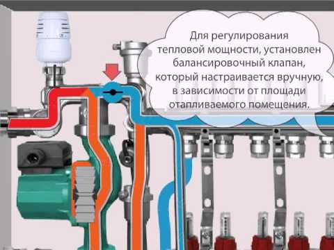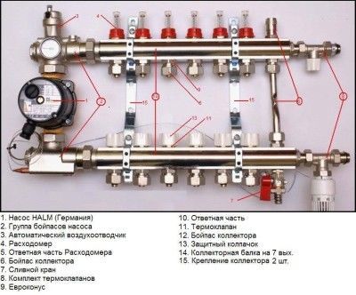 Шкафът на колектора е снабден с блок, отговорен за регулиране на водния поток, който влиза в пода на пода и се връща обратно.