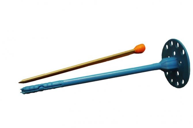 - Механично закрепване. Обикновен пластмасов дюбел с глава с диаметър 7-8 см. Използването му ви позволява допълнително да фиксирате изолацията. Има две различни дължини на „чадърите“: 8 и 25 см. Конкретният избор на размер зависи от дебелината на изолацията и разстоянието между нея и стената на къщата;