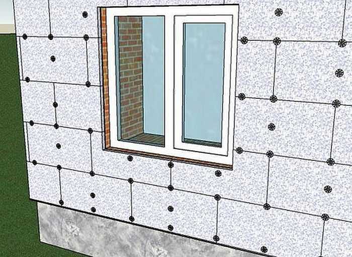 За добро фиксиране, твърди листове изолация са прикрепени на 5-6 точки. Но за икономия и бързина на монтажа основната част на дюбелите побира 2 листа наведнъж. Как се прави това е показано на модела: