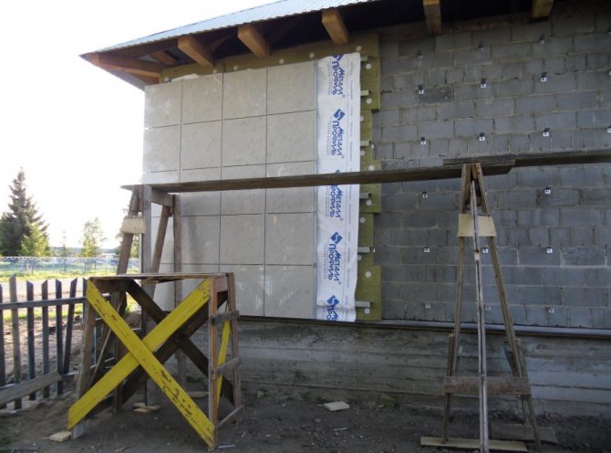 - Вторият вариант е да се използва минерална вата. Този тип фасада ще струва малко повече, но това има своите предимства. Материалът е имунизиран срещу въздействието на открит огън, а също така има висока паропропускливост, което ви позволява да създадете „дишаща структура“. Допустимата плътност на плоскостите трябва да бъде най-малко 150 kg / m3, а якостта на опън трябва да бъде 15 kPa.