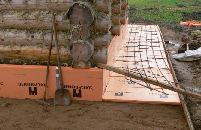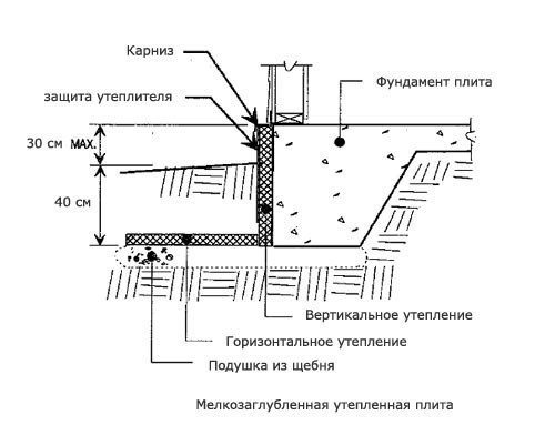 За изграждането на дървени и рамкови къщи в повечето случаи се използват плитки основи. Те са направени от бетон или тухла под формата на лентова или плоча конструкция.По-добре е да изолирате такава основа отвън. Топлоизолационният слой е разположен на разстояние около 1,5 м, зад което се създава незамръзващ почвен слой.