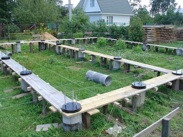 - фиксирайте трупи / греди с предварително изрязан жлеб върху стълбовете, вмъкнете дъски (40-60 мм) в тях, така че долната дъска да лежи върху пясъчна възглавница;