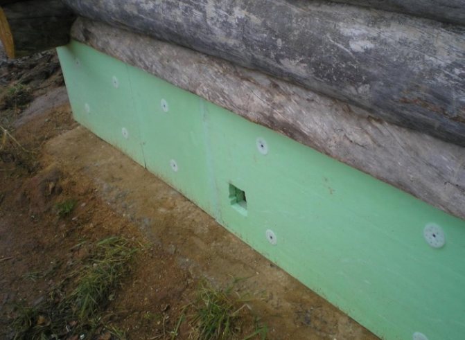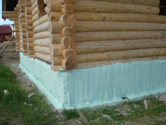 Лентовият фундамент около външната страна се изкопава в изкоп с ширина 50 см. Дълбочината се поддържа най-малко 80 см. В изкопа се изсипва 20 см слой пясък. Бетонната лента се почиства от мръсотия и се обработва с горещ битум. След като хидроизолацията се втвърди, цокълът е облицован с полистирол или експандиран полистирол. Плочи с дебелина 15 см са залепени с пяна, допълнително фиксирани с дюбели с чадъри.