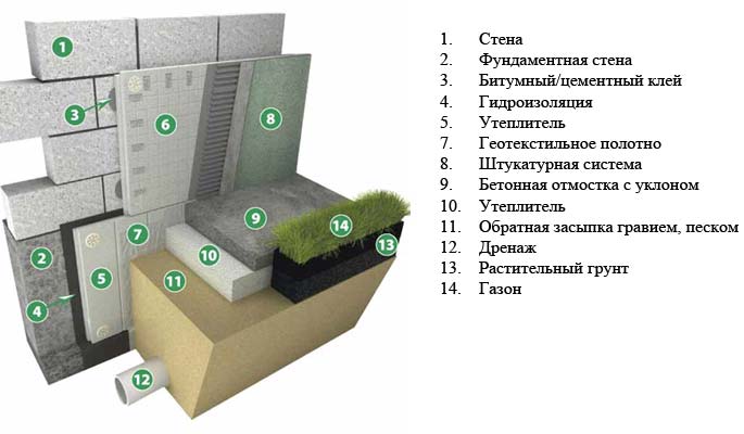 След приключване на монтажа на топлоизолационния материал, пристъпваме към полагане на слой битум или каучук. Можете да затворите целия слой изолация с половин тухлена зидария или дъски. Може да се използва и за защита на пяна и геотекстил. След това се прави сляпа зона.