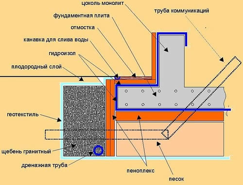 Монолитна основа обикновено се полага под баня в заблатена зона. Основата е изолирана на етапа на строителството. Експандираният полистирол е вграден между слоевете на бетонната замазка. На стените извън сутерена на банята, направете си сам изолация се извършва съгласно принципа на лентовата основа.