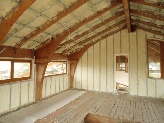 Характеристика на тавана е сложната форма на покрива. Използването на твърди плочи не е възможно в някои области. Валцуваните материали се плъзгат по склоновете, минералната вата се слепва. Популярен вариант за изолация е полагането на базалтови плочи, но те трябва да бъдат защитени от влага от двете страни с мембрани. С полиуретанова пяна всичко е просто. Напръскайте пяна върху повърхности с всякаква сложност. Дори върху фрактурите на покрива се образува един запечатан слой.
