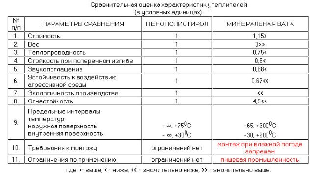 Таблицата показва резултатите от сравнението на свойствата на топлоизолацията в конвенционални единици: