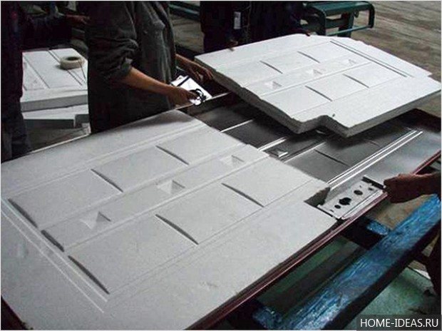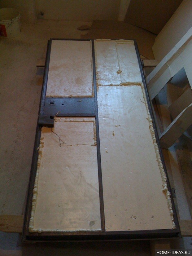 След това те започват да полагат отрязаните парчета пяна в кухината на "скелета" на вратата. За надеждно закрепване на топлоизолационния материал към железния лист се използва полиуретанова пяна.