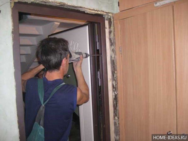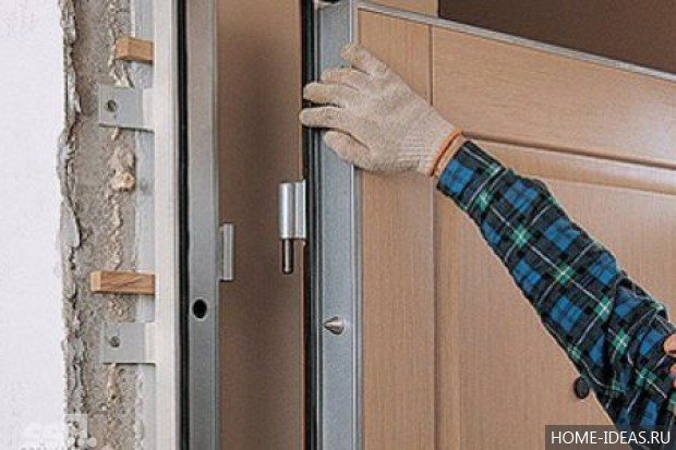 - Преди да изолирате желязна врата в апартамент, крилото трябва да се отстрани от сенниците, поставени върху хоризонтална повърхност.