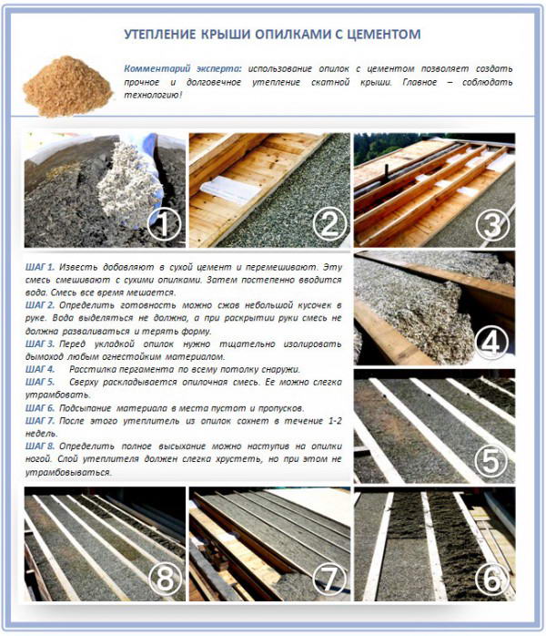 Ефективността на изолацията на покрива с топлоизолационна смес на базата на дървени стърготини и глина или вар зависи от правилния монтаж, както и от качеството на подготвителната работа. Задължително е дървесните стърготини да се третират с лекарства, противопожарни съединения, антисептик, да се добавят вещества, които отблъскват гризачи и насекоми. Изолацията с дървени стърготини на студен покрив се извършва в следната последователност: