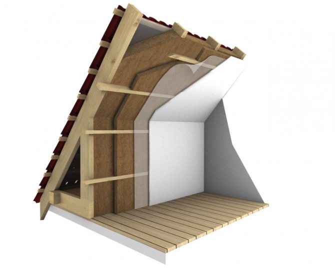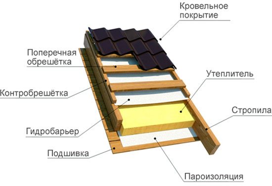 Отдолу, фиксирана върху контрарешетката на велпапето, има хидроизолация, в посока на падане - изолация, след това пароизолация и вътрешна довършителна облицовка.