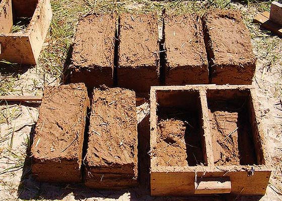 За да придобиете кирпич, трябва само да имате дървена форма и желание за работа. Месенето (и месенето на глина със слама с крака) обикновено се извършва непосредствено до глинената кариера, там формите се пълнят с получената маса и блоковете се сушат там.
