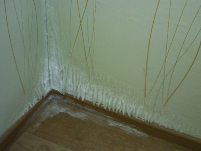 Важно! Не трябва да използвате монтажна пяна за запълване на пукнатини, тъй като тя абсорбира перфектно влагата, пропускайки излишната вода вътре в стаята.