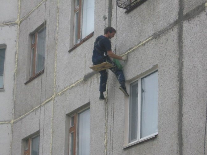 За производството на външна изолация е необходимо да поканите индустриални алпинисти или да използвате услугите на лакътна кула.