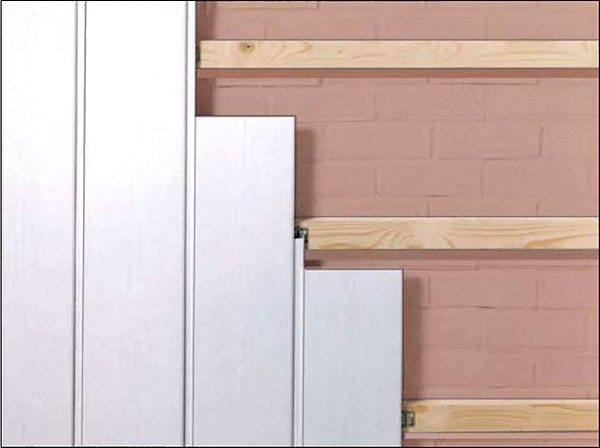 Решетката означава спомагателни дървени летви, които преди това са монтирани вертикално или хоризонтално на стената. Самите панели вече са прикрепени към тези летви.